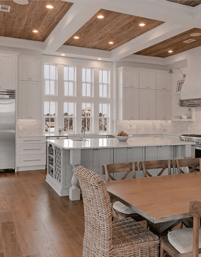 A coffered ceiling design in the centre of a large living room adds visual interest to the space.